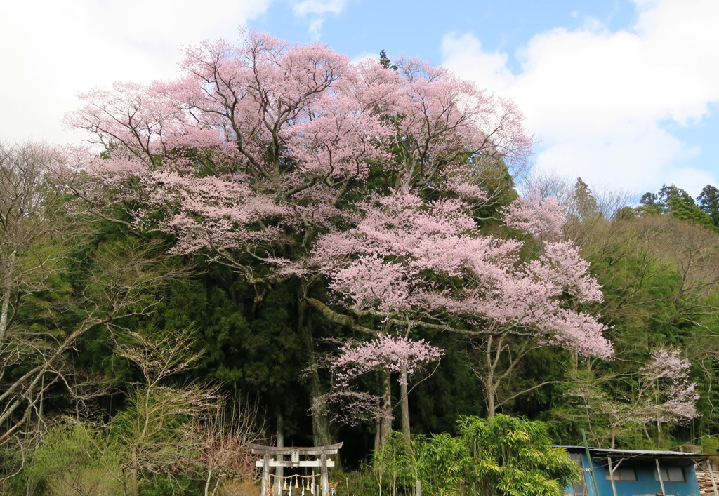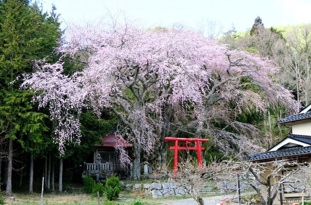 今度は昼神の八王子神社の夫婦桜へ。よく見ると桜は3本です。既に散り始めていて、そろそろ見頃を終えそう。